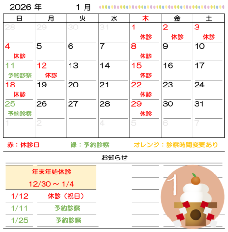 今月の日曜日予約診察は1/11と1/25となります。