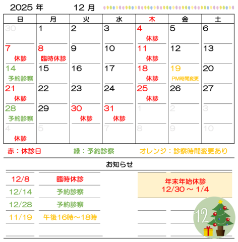 12/19(金)午後診察は受付時間が16時から18時となりますのでお間違えのないようお願いいたします。